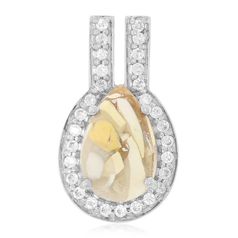 Dieser bezaubernde Anhänger zeigt einen fesselnden tropfenförmigen Mookaite-Cabochon von 3,8 Karat, der von einem Kranz funkelnder kambodschanischer Zirkonsteine von insgesamt 0,62 Karat umgeben ist. Der Anhänger ist aus glänzendem 925er Sterlingsilber gefertigt und kombiniert auf elegante Weise die erdigen Farbtöne des Mookaite mit dem Glanz der Zirkone. Er eignet sich perfekt, um Ihrer Garderobe einen Hauch von Raffinesse zu verleihen, und ist ein ideales Accessoire sowohl für legere Brunchs als auch für formelle Abendveranstaltungen.