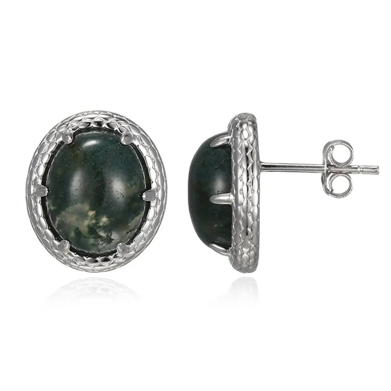 Entdecken Sie die erdige Eleganz dieser südafrikanischen Moosachat-Ohrringe mit ovalen Cabochon-Edelsteinen, die in makellosem 925er Sterlingsilber gefasst sind. Mit einem Gesamtgewicht von 7,135 Karat bieten diese Ohrstecker einen Einblick in die Kunstfertigkeit der Natur, mit Mustern, die an eine moosbewachsene Landschaft erinnern. Die 12×10 mm großen Edelsteine werden von einem silbernen Seil umrahmt, das einen Hauch von Raffinesse verleiht. Diese Ohrringe sind ebenso vielseitig wie schön und eignen sich ideal zur Aufwertung von Freizeitoutfits oder als einzigartiger Akzent für die Abendgarderobe.