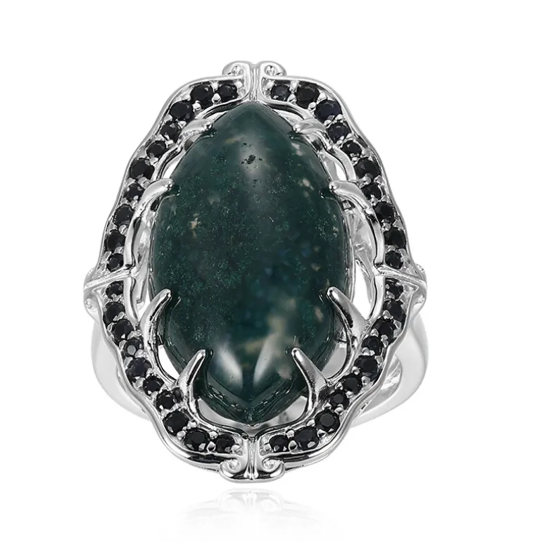 Entdecken Sie die geheimnisvolle Anziehungskraft dieses Rings aus südafrikanischem Moosachat, gekrönt von einem Marquise-Cabochon-Schliff von 7,872 Karat und umrahmt von einer Reihe funkelnder schwarzer Saphire von insgesamt 0,492 Karat aus Madagaskar. Dieses aus 925er Sterlingsilber gefertigte Schmuckstück strahlt Eleganz und Raffinesse aus. Der große Achat von 22×13 mm, gefasst in einem Ring von 28×21 mm, ist ein stilistisches Statement, das ihn zur idealen Wahl für große Anlässe macht oder einen Hauch von Drama zu Ihrer Alltagskleidung hinzufügt.