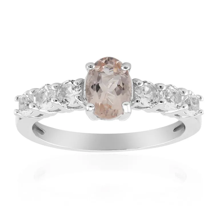 Schmücken Sie Ihre Hand mit dem sanften Glanz dieses Morganit-Rings aus Mosambik, der von funkelnden weißen Topasen von insgesamt 0,702 Karat flankiert wird. Der aus poliertem 925er Sterlingsilber gefertigte Ring ist mit einem Morganit im Ovalschliff von 0,597 Karat besetzt. Sein sanfter Pfirsichton kontrastiert vorzüglich mit der Klarheit der Topase im Rundschliff. Dieser Ring eignet sich perfekt, um Ihrer Alltagskleidung oder besonderen Anlässen einen Hauch von dezenter Eleganz zu verleihen und strahlt schicke Raffinesse aus. Die Größe des Rings von 24×21 mm sorgt für eine signifikante Präsenz, die bemerkt und bewundert werden wird.