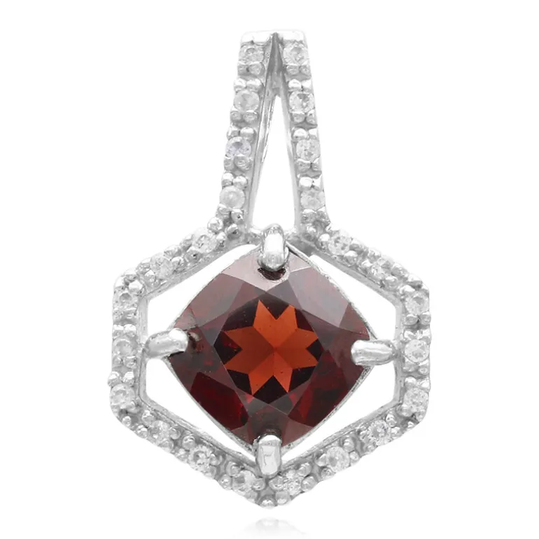 Dieser exquisite Anhänger zeigt einen antiken Mosambik-Granat von 1,64 Karat im Kissenschliff, umgeben von 24 funkelnden Zirkonen aus Kambodscha. Das elegante Design aus 925er Sterlingsilber hebt den tiefroten Granat hervor, der von Zirkonen im Brillantschliff akzentuiert wird. Dieser Anhänger eignet sich perfekt für die Abendgarderobe oder als raffiniertes Accessoire für die Freizeitgarderobe und ist eine verführerische Ergänzung für jede Schmucksammlung.