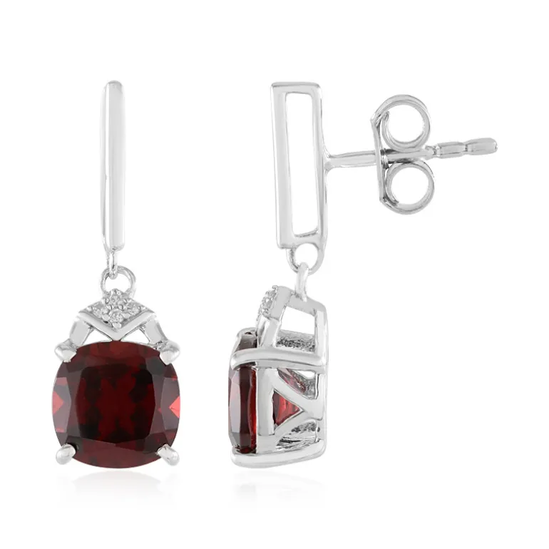 Diese atemberaubenden Ohrringe bestehen aus zwei Mosambik-Granaten im antiken Kissenschliff, die tiefrote Farbtöne aufweisen und Luxus ausstrahlen. Die Ohrringe aus 925er Sterlingsilber sind mit kambodschanischen Zirkon-Akzenten verziert. Sie eignen sich perfekt, um der Abendgarderobe Eleganz zu verleihen oder die Freizeitgarderobe aufzuwerten, und sind zu jedem Anlass ein schönes Statement.