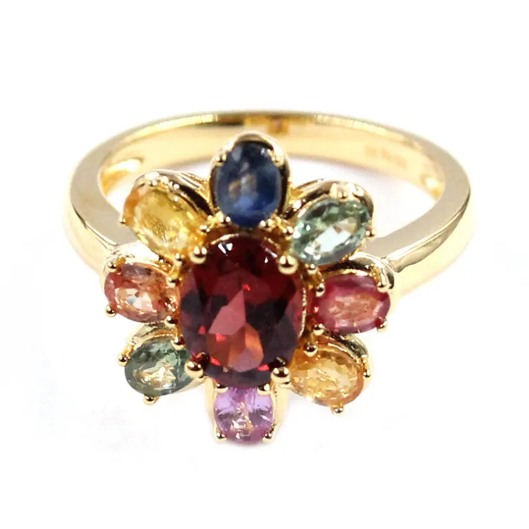 Entdecken Sie den strahlenden Charme dieses vergoldeten Rings aus Sterlingsilber mit einem atemberaubenden Mosambik-Granat von 1,25 Karat im Ovalschliff als Herzstück. Umgeben von einer Reihe mehrfarbiger Saphire aus Madagaskar von insgesamt 1,564 Karat, erblüht dieser Ring in leuchtenden Farbtönen, die an einen sonnenverwöhnten Garten erinnern. Die Vergoldung mit 925er Silber verleiht dem gesamten Design einen Hauch von Luxus und macht ihn zu einem idealen Accessoire, das sowohl legere als auch formelle Outfits aufwertet. Ob für feierliche Anlässe oder als eleganter Alltagsschmuck, dieser Ring verspricht, jedem Look einen Hauch von Farbe und Raffinesse zu verleihen.