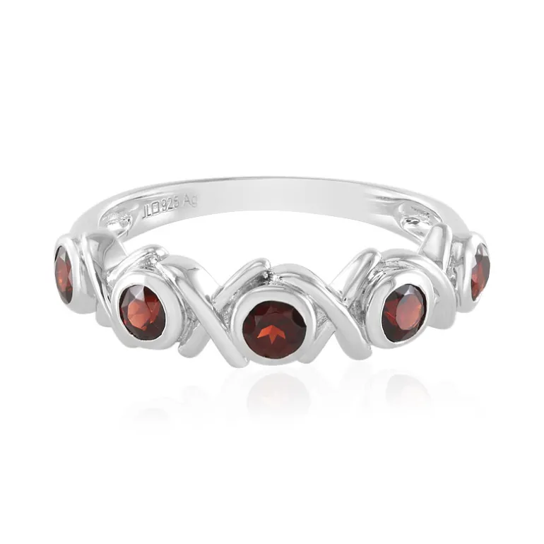 Tauchen Sie ein in die reichen, warmen Farben Mosambiks mit diesem prächtigen platinierten Silberring, der fünf sorgfältig facettierte runde Granate von insgesamt 0,693 Karat präsentiert. Jeder der etwa 3 mm großen Edelsteine ist in ein elegantes und modernes Design eingebettet, das sich anmutig um den Finger schmiegt. Das glänzende Band aus 925er Sterlingsilber bietet einen bequemen Sitz und dauerhafte Eleganz. Dieses Schmuckstück ist ebenso vielseitig wie schön und eignet sich perfekt, um der Alltagskleidung einen Farbtupfer zu verleihen oder die Abendgarderobe mit seiner subtilen Raffinesse zu ergänzen.