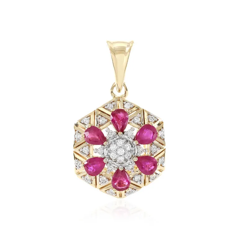 Entdecken Sie den verführerischen Charme dieses Anhängers mit Mosambik-Rubin, der in luxuriösem 585er Gelbgold gefasst ist. Ein Cluster aus sechs Rubinen, jeder meisterhaft in Tropfenform geschliffen, strahlt in einem lebhaften Rosaton, ergänzt durch 31 funkelnde Diamanten von insgesamt 0,198 ct. Die geometrische Brillanz dieses 27 x 16 mm großen Schmuckstücks strahlt Raffinesse aus. Ein vielseitiges Schmuckstück für den Alltag und besondere Anlässe, das ein klassisches Kleid oder ein schickes Ensemble glänzend zur Geltung bringt.