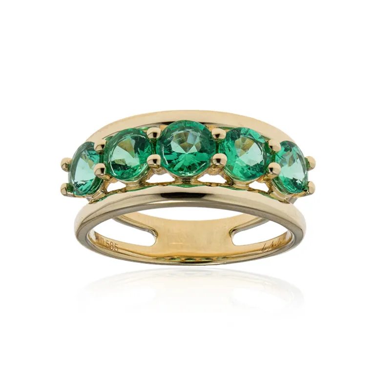 Dieser exquisite Ring enthält fünf Muzo-Smaragde im Rundschliff aus Kolumbien, die wunderschön in 14-karätiges Gelbgold gefasst sind. Mit einem Gesamtgewicht von 1,845 Karat funkeln die leuchtend grünen Edelsteine anmutig und machen ihn zu einem außergewöhnlichen Schmuckstück. Er eignet sich sowohl für elegante Abendgarderobe als auch für einen Hauch von Luxus im Alltag. Kombinieren Sie ihn mit einer Smaragd-Halskette für einen stimmigen Look bei besonderen Anlässen.