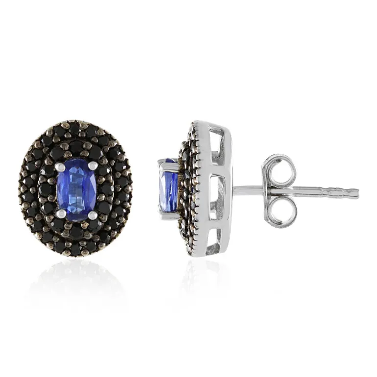 Tauchen Sie ein in die Eleganz dieser exquisiten nepalesischen Kyanit-Ohrringe mit zwei atemberaubenden Kyaniten im Ovalschliff, umgeben von glitzernden schwarzen Spinellen aus Thailand. Die 11 mm großen Ohrringe sind aus platiniertem 925er Sterlingsilber gefertigt und verleihen jedem Outfit einen raffinierten Touch. Sie eignen sich perfekt für einen glamourösen Abend und sind ein vielseitiges Accessoire, das Ihrer Alltagskleidung einen Hauch von Farbe verleiht.