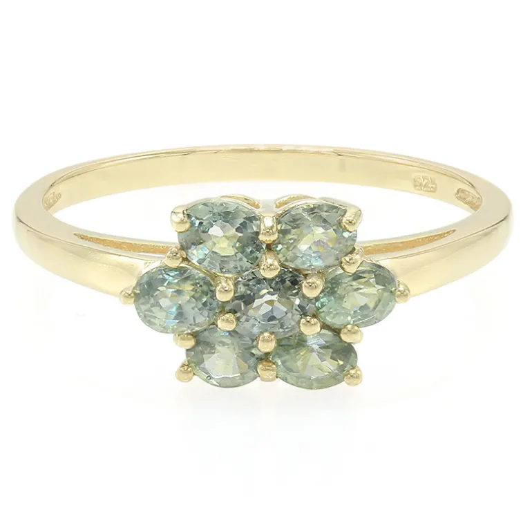 Dieser wunderschön gearbeitete Ring besteht aus sieben unbehandelten grünen Saphiren im Ovalschliff aus Tansania mit einem Gesamtgewicht von 1,06 Karat. Eingebettet in 925er Sterlingsilber mit einer warmen Goldplattierung, strahlt jeder 3,5×3 mm große Edelstein eine natürliche, erdige Eleganz aus. Das raffinierte Design, akzentuiert durch die schimmernde Goldumgebung, macht ihn zu einem vielseitigen Schmuckstück, das sich sowohl für zwanglose Ausflüge als auch für formellere Anlässe eignet. Sein geringes Gewicht von ca. 1,44 g sorgt für angenehmen Tragekomfort bei jeder Gelegenheit.