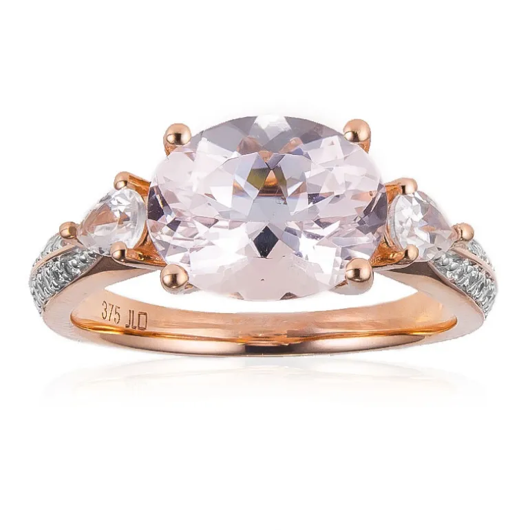 Bewundern Sie die Gelassenheit dieses atemberaubenden Rings aus unerhitztem rosa Beryll, gekrönt von einem glänzenden Edelstein von 2,26 Karat, eingefasst in 9-karätiges Roségold. Flankiert von funkelnden tränenförmigen und runden Zirkonen aus Tansania mit einem Gesamtgewicht von 0,356 ct, vereinen sich seine errötenden Farbtöne und schimmernden Begleiter zu einem Sinnbild der Anmut. Dieses elegante Schmuckstück verwandelt sich mühelos vom Charme des Tages in die Eleganz des Abends und ist damit die ideale Ergänzung für Ihre anspruchsvolle Garderobe. Ob zu einem besonderen Anlass oder als wertvolles Geschenk, der subtile Glamour dieses Rings wird Sie in seinen Bann ziehen.