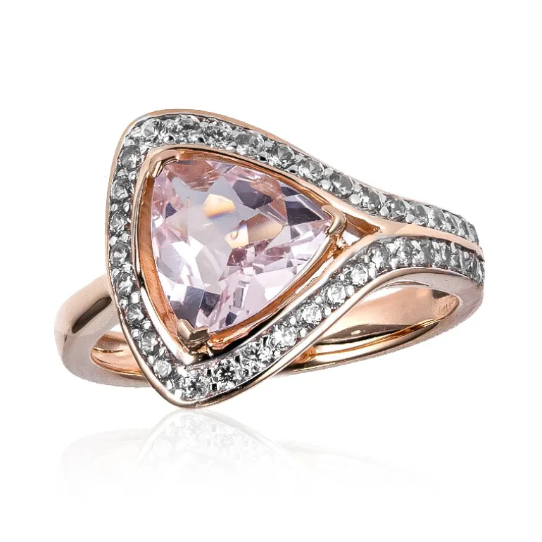 Entdecken Sie die Anziehungskraft dieses atemberaubenden Rings mit einem exquisiten rosa Beryll im Trillantschliff von 1,03 Karat aus Brasilien, der elegant in 9 Karat Roségold gefasst ist. Eingerahmt von einem Halo aus funkelnden Zirkonsteinen im Rundschliff aus Tansania mit einem Gesamtgewicht von 0,516 ct, strahlt dieses Schmuckstück einen schicken und modernen Charme aus. Die warmen Farbtöne des Roségoldes ergänzen den zartrosa Beryll und machen diesen Ring zu einer vielseitigen Wahl sowohl für den Alltag als auch für besondere Anlässe. Kombinieren Sie ihn mit pastellfarbenen oder neutral getönten Outfits, um seine sanfte Farbe und Anmut zu betonen.