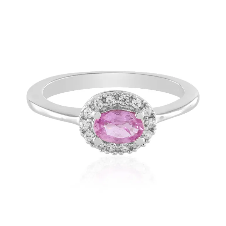 Entdecken Sie die Eleganz dieses rosafarbenen Ceylon-Saphirrings mit einem oval geschliffenen Edelstein von 0,406 Karat aus Sri Lanka, der von 14 kambodschanischen Zirkonsteinen umgeben ist. Der Ring ist aus plattiertem 925er Sterlingsilber gefertigt und bietet eine zarte und raffinierte Ausstrahlung. Dieser Ring eignet sich perfekt für Abende oder besondere Anlässe und passt sowohl zu legeren als auch zu formellen Outfits und verleiht Ihrem Stil einen Hauch von Anmut.