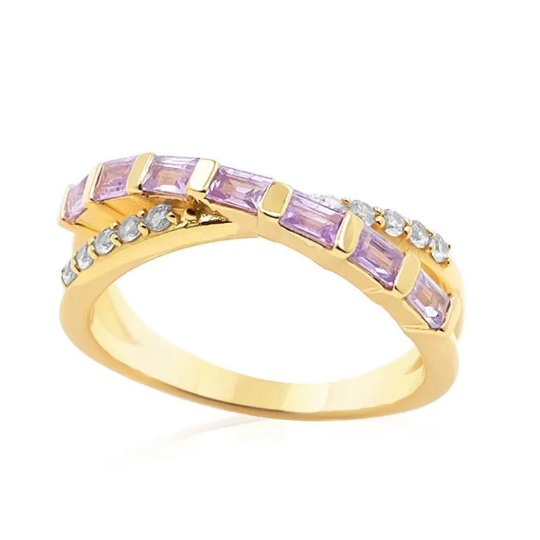 Dieser atemberaubende Ring zeigt eine Reihe von unerhitzten violetten Ceylon-Saphiren mit einem Gesamtgewicht von 0,63 Karat, die elegant im Baguetteschliff gefasst sind. Die leuchtenden Farbtöne werden durch funkelnde Zirkone aus Kambodscha mit einem Gesamtgewicht von 0,198 Karat akzentuiert. Das Band aus 925er Sterlingsilber ist aufwändig vergoldet und verleiht dem Schmuckstück einen Hauch von Glamour. Mit einer Größe von 22 x 21 mm ist dieser Ring ein Beweis für raffinierten Stil und Handwerkskunst. Er eignet sich perfekt für Abendveranstaltungen oder als Farbtupfer für Ihren Alltagslook.