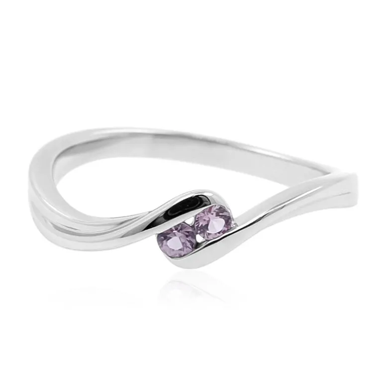 Entdecken Sie die schlichte Eleganz dieses Rings aus 925er Sterlingsilber mit zwei nicht erhitzten, rund geschliffenen violetten Ceylon-Saphiren von insgesamt 0,101 Karat, die direkt aus Sri Lanka bezogen werden. Das wirbelnde Design ist sowohl modern als auch zeitlos und verleiht jedem Outfit einen Hauch von Raffinesse. Ob zu Bürokleidung oder einem legeren Ensemble, dieser Ring ist eine vielseitige Ergänzung Ihrer Schmucksammlung.