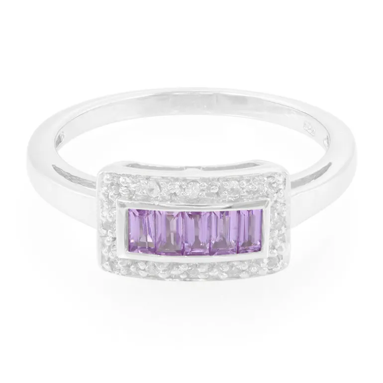 Dieser schicke Ring aus 925er Sterlingsilber glänzt mit fünf exquisiten violetten Ceylon-Saphiren im einzigartigen Baguetteschliff mit einem Gesamtkaratgewicht von 0,32ct. Zwölf weiße Saphire aus Madagaskar im Brillantschliff mit einem Gesamtgewicht von 0,074 ct vervollständigen das filigrane Design. Die Komposition strotzt nur so vor leuchtenden Farben und ist das perfekte Accessoire für legere und elegante Outfits. Er verspricht, jedem Anlass einen Hauch von Raffinesse zu verleihen, insbesondere bei Abendveranstaltungen, wo sein Glanz voll zur Geltung kommt.