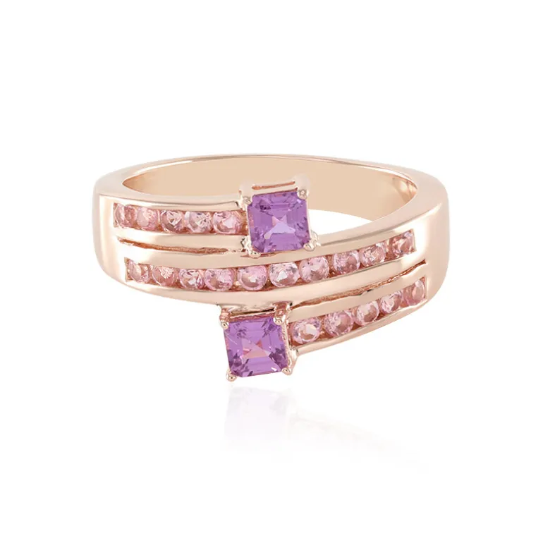 Dieser schicke Ring aus rosévergoldetem Sterlingsilber ist ein Inbegriff moderner Eleganz. Im Mittelpunkt steht ein Paar unberührter, sattvioletter Ceylon-Saphire. Das Schmuckstück mit einem Gesamtgewicht von 1,458 Karat wird von einem Halo aus funkelnden rosa Turmalinen akzentuiert und ist in einem modernen offenen Design gefasst. Der Asscher-Schliff hebt die Tiefe der Saphire hervor und macht ihn zu einer raffinierten Wahl für Abendveranstaltungen oder als Accessoire. Kombinieren Sie ihn mit pastellfarbenen oder neutralen Outfits, um seine leuchtenden Farbtöne zur Geltung zu bringen.