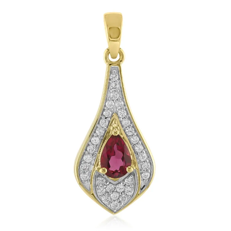 Entdecken Sie den Charme dieses Anhängers aus 9-karätigem Gold, der von einem tief gefärbten nigerianischen Rubellit von 0,34 Karat im Tropfenschliff akzentuiert wird. Verziert mit 31 funkelnden Zirkon-Edelsteinen aus Tansania, verbindet dieses Schmuckstück zeitlose Eleganz mit modernem Charme. Das zarte Design mit einem Gewicht von ca. 1,75 g in Gold eignet sich perfekt, um Ihrer Alltagskleidung einen Hauch von Raffinesse zu verleihen oder ein besonderes Abendoutfit aufzuwerten. Die bezaubernde Farbe und der schimmernde Glanz des Anhängers machen ihn zu einem exquisiten Geschenk für einen besonderen Menschen oder zu einer wertvollen Ergänzung Ihrer Schmucksammlung.
