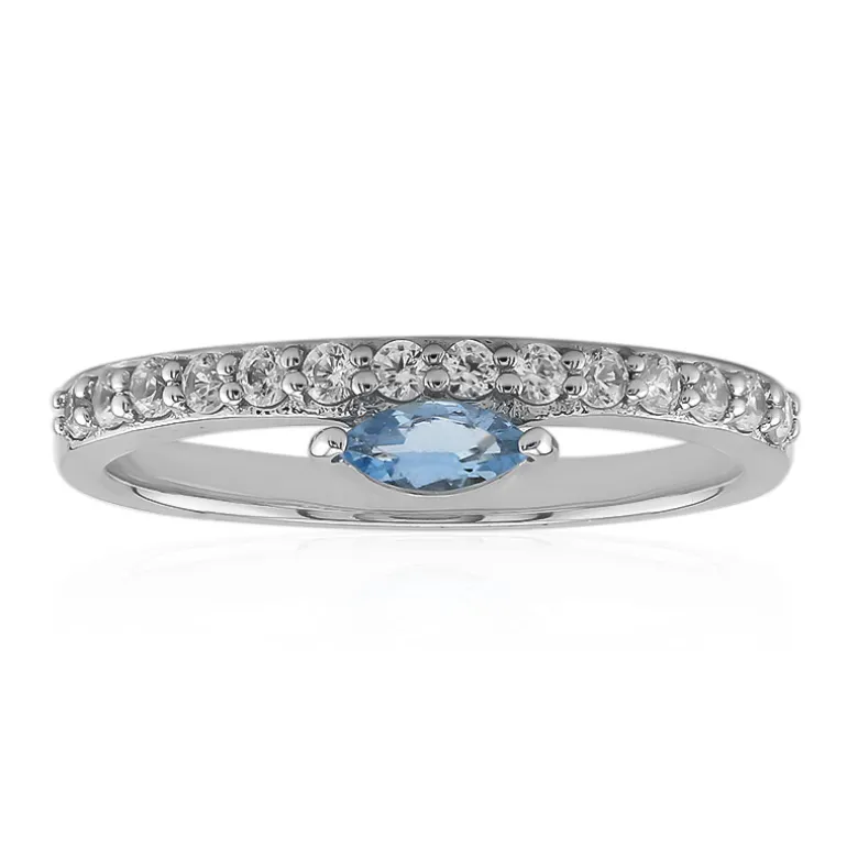 Entdecken Sie die Eleganz dieses Rings aus Sterlingsilber mit einem nigerianischen Ofiki-Aquamarin im Marquiseschliff, der ruhige, blaue Farbtöne ausstrahlt. Umgeben von funkelnden Zirkonen im Rundschliff aus Tansania, besticht dieses Schmuckstück mit einem Gesamtgewicht von 0,411 ct. Die Platinplattierung des 925er Silberbandes sorgt für dauerhaften Glanz und Raffinesse. Dieser Ring ist eine vielseitige Ergänzung für jede Schmucksammlung, egal ob Sie sich für einen Abend herausputzen oder Ihre Freizeitkleidung akzentuieren möchten.