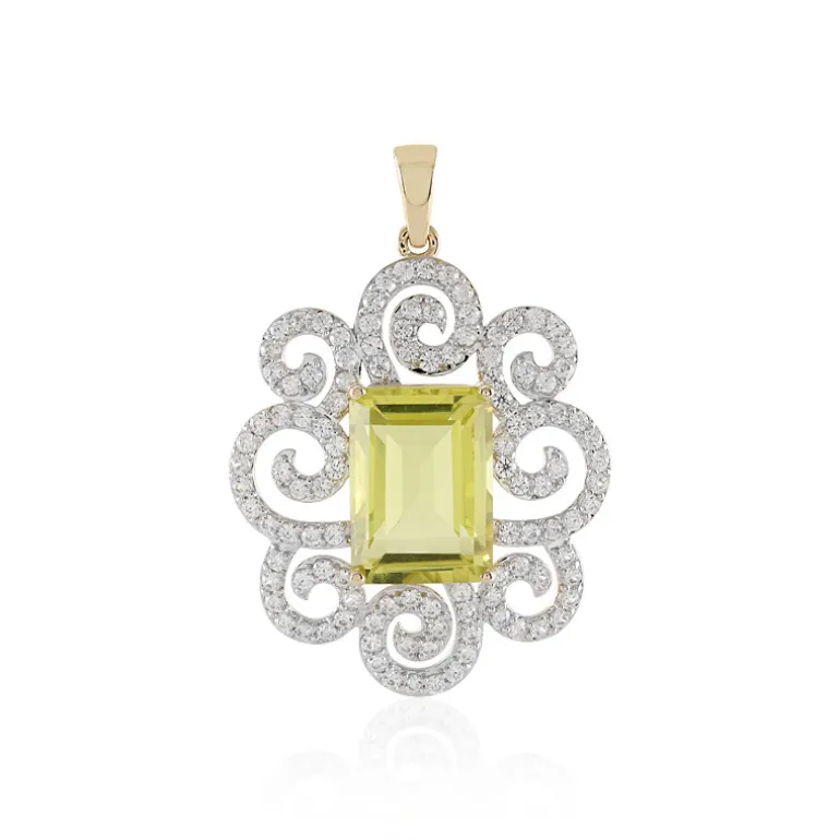 Beleuchten Sie Ihr Ensemble mit diesem atemberaubenden Anhänger mit einem brasilianischen Ouro-Verde-Quarz von 6,84 Karat. Der achteckige, stufenförmig geschliffene Quarz strahlt ein fröhliches, gelbes Leuchten aus und wird von 112 kambodschanischen Zirkonen mit einem Gesamtgewicht von 1,917 Karat umrahmt, die kunstvoll in 9-karätigem Gold gefasst sind und etwa 4,45 g wiegen. Mit seinen Maßen von 40×28 mm ist sein fesselndes Design ein Zeugnis für die Kunst der Schmuckherstellung. Dieser Anhänger ist ideal für feierliche Anlässe oder als Farbtupfer für ein schickes Tagesoutfit und wird für Gesprächsstoff sorgen.