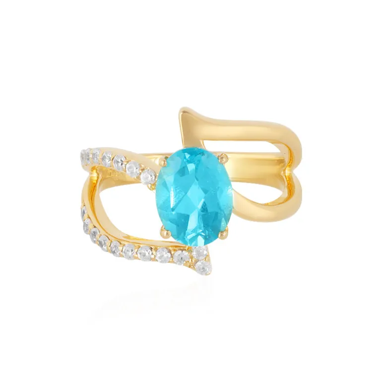 Treten Sie ein in die Welt der lebendigen Eleganz mit diesem vergoldeten Sterlingsilberring, der einen atemberaubenden brasilianischen Paraiba-Topas von 1,93 Karat als Herzstück präsentiert. Umgeben von funkelnden Zirkon-Akzenten aus Tansania mit einem Gesamtgewicht von 0,243 Karat, strahlt dieser Topas im Ovalschliff exquisite ozeanische Farbtöne aus. Das offene Ringdesign strahlt einen modernen Charme aus und macht ihn zu einem idealen Accessoire für moderne, modebewusste Outfits. Er lässt sich wunderbar mit Tageskleidung kombinieren oder verleiht der Abendgarderobe einen Hauch von Farbe. Mit einem Gesamtgewicht von 2,175 ct ist dieser Ring eine luxuriöse Ergänzung für jede Schmucksammlung.