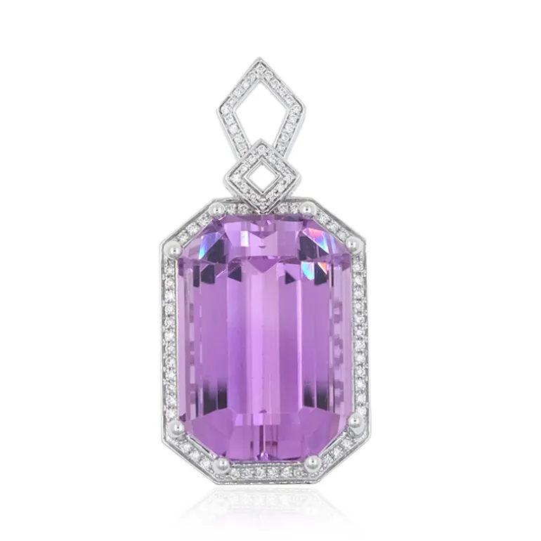 Entdecken Sie die leuchtende Eleganz dieses exquisiten Kunzit-Anhängers von Afghan Patroke, ein Meisterwerk aus 18 Karat Weißgold. Sein Herzstück, ein Kunzit im Oktagon-Schliff (40,005), hat einen leuchtenden Lavendelton und wird von 77 funkelnden SI2-Diamanten (insgesamt 0,291 ct) umrahmt, die seine Brillanz verstärken. Mit einer Größe von ca. 40 x 19,5 mm ist dieser AMAYANI-Anhänger ein elegantes Statement für die glamourösesten Anlässe. Kombinieren Sie ihn mit einem eleganten Abendkleid und lassen Sie seinen bezaubernden Charme erstrahlen.