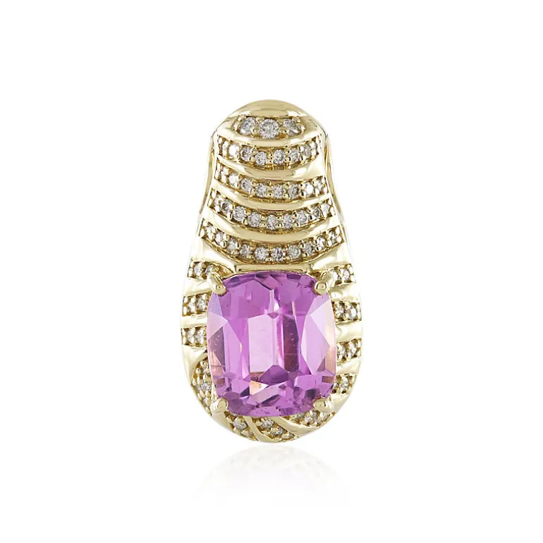 Entdecken Sie die Faszination dieses atemberaubenden Anhängers mit einem afghanischen Patroke-Kunzit von 5,85 ct. im verführerischen Antikschliff, der in 14-karätigem Gold gefasst ist. Dieses 24×13 mm große Schmuckstück wird von einem Halo aus 62 funkelnden SI2-Diamanten mit insgesamt 0,279ct und drei weiteren SI2-Diamanten mit 0,041ct akzentuiert und strahlt Raffinesse aus. Sein majestätischer violetter Farbton und die brillanten Diamantakzente verleihen jedem Outfit einen königlichen Touch und machen ihn zu einer spektakulären Wahl für besondere Anlässe oder für die Eleganz des Alltags.