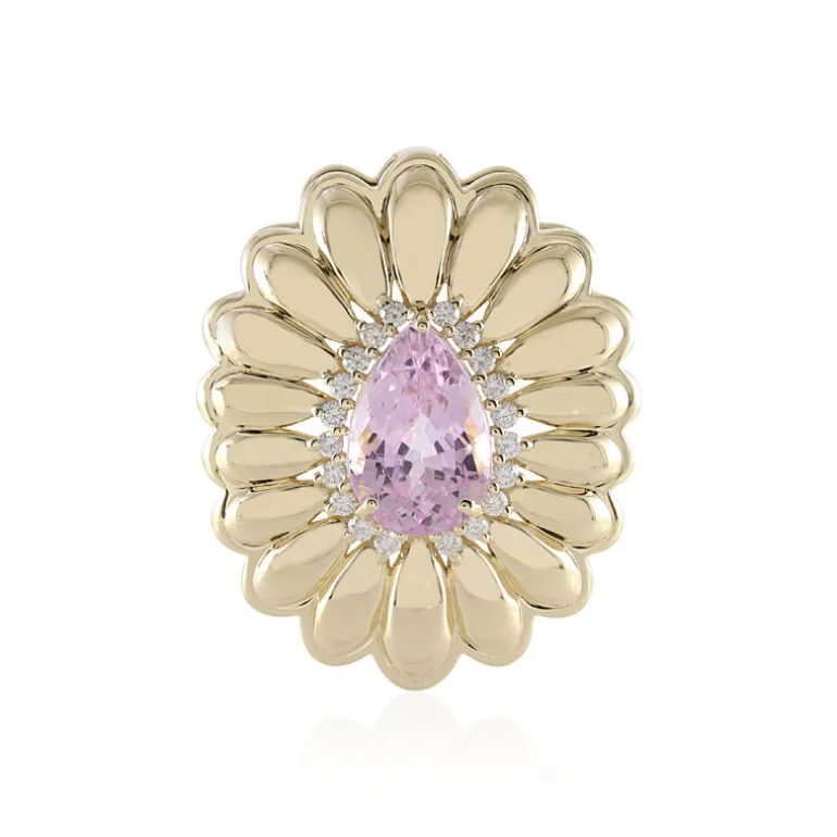 Entdecken Sie die Faszination des Patroke Kunzite Goldanhängers mit einem atemberaubenden Kunzit im Birnenschliff von 3,819 Karat aus Afghanistan, umgeben von 20 funkelnden Diamanten von insgesamt 0,285 Karat. Dieser elegante Anhänger aus 9 Karat Gelbgold verleiht jedem Outfit einen Hauch von Eleganz. Es ist ideal für besondere Anlässe oder für den Alltag und passt sowohl zu formellen als auch zu legeren Outfits.