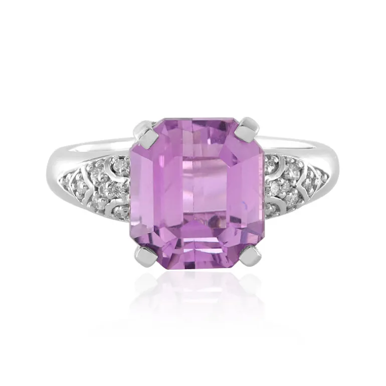 Entdecken Sie die Anziehungskraft dieses auffälligen Rings aus 14 Karat Weißgold mit einem prächtigen afghanischen Patroke-Kunzit im Oktagon-Schliff von 4,95 Karat, der für seine lebhaften lilafarbenen Töne bekannt ist. Verziert mit einer Reihe funkelnder SI2-Diamanten mit einem Gesamtgewicht von 0,103 ct, strahlt dieses Schmuckstück Luxus aus. Das komplizierte Design zeigt Edelsteine, die kunstvoll gefasst sind, um ihre Brillanz zu betonen. Dieser Ring eignet sich perfekt für besondere Anlässe oder als elegante Ergänzung Ihrer Alltagsgarderobe und ist eine zeitlose Ergänzung für jede Schmucksammlung.