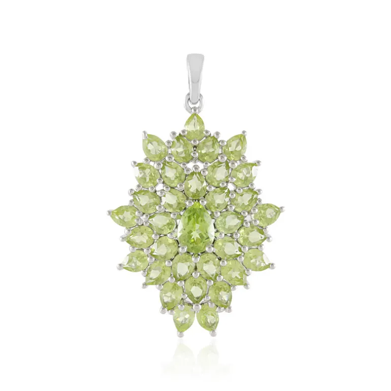 Dieser exquisite Anhänger besteht aus 34 Peridots im Birnenschliff aus China mit einem Gesamtkaratgewicht von 5,539 ct, die elegant in 925er Sterlingsilber mit Platinfassung gefasst sind. Mit den Maßen 39×24 mm strahlt das Schmuckstück einen eleganten, lebendigen Look aus. Er eignet sich sowohl für legere als auch für formelle Anlässe. Kombinieren Sie diesen Anhänger mit einem fließenden Kleid oder einer eleganten Bluse, um ein Statement zu setzen.