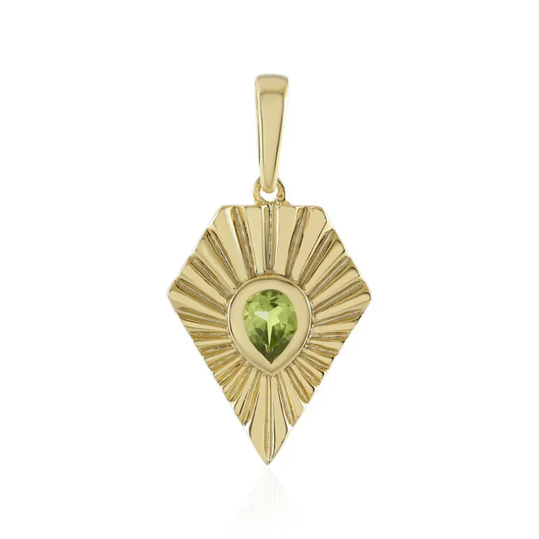 Entdecken Sie die Eleganz unseres Peridot-Anhängers aus vergoldetem Silber. Dieses atemberaubende Schmuckstück besteht aus einem 0,315 Karat schweren Peridot aus China, der in einen einzigartig gestalteten Anhänger aus 925er Sterlingsilber gefasst ist, der für ein exquisites Finish wunderschön vergoldet wurde. Der Edelstein im Tropfenschliff funkelt inmitten eines auffälligen Musters, das sowohl legere als auch formelle Outfits perfekt aufwertet. Ideal, um jedem Anlass einen Hauch von Luxus zu verleihen.