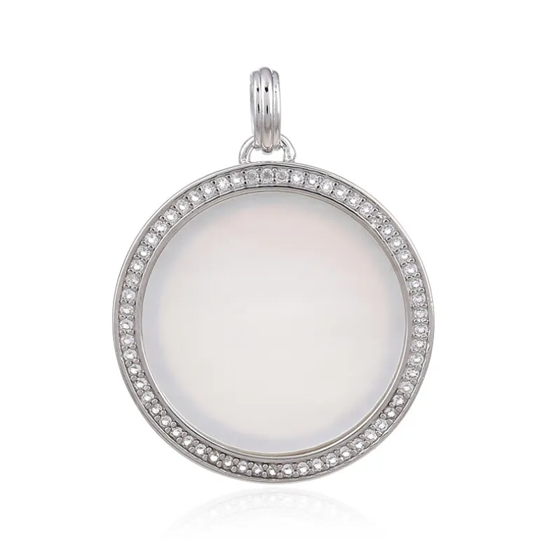 Tauchen Sie ein in den schillernden Glanz dieses runden chinesischen Perlmutt-Anhängers, der von 61 funkelnden weißen Topasen aus Brasilien mit insgesamt 0,62 ct umgeben ist. Der Anhänger aus poliertem 925er Sterlingsilber misst 31 x 25 mm und bietet ein elegantes Gleichgewicht aus subtilem Glanz und strahlendem Funkeln. Dieses vielseitige Accessoire eignet sich perfekt, um einen schicken Tageslook zu unterstreichen oder ein Abendoutfit aufzuwerten und begleitet Sie mit Anmut und Raffinesse durch jede Veranstaltung.