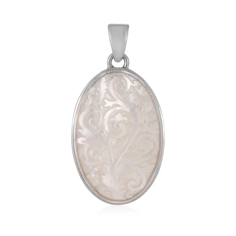 Entdecken Sie die Faszination der indonesischen Handwerkskunst mit diesem fesselnden ovalen Anhänger. Er ist aus platiniertem 925er Sterlingsilber gefertigt und zeigt eine schimmernde Perlmutteinlage mit verschlungenen, von balinesischen Barong inspirierten Mustern. Das sanfte Schimmern des Edelsteins in Kombination mit dem haltbaren Feinsilber macht diesen Anhänger zu einem Schmuckstück in Erbstückqualität. Er eignet sich sowohl für den eleganten Alltag als auch für besondere Anlässe und ergänzt eine Reihe von Stilen, von einem frischen weißen Hemd bis zu einem fließenden Abendkleid.