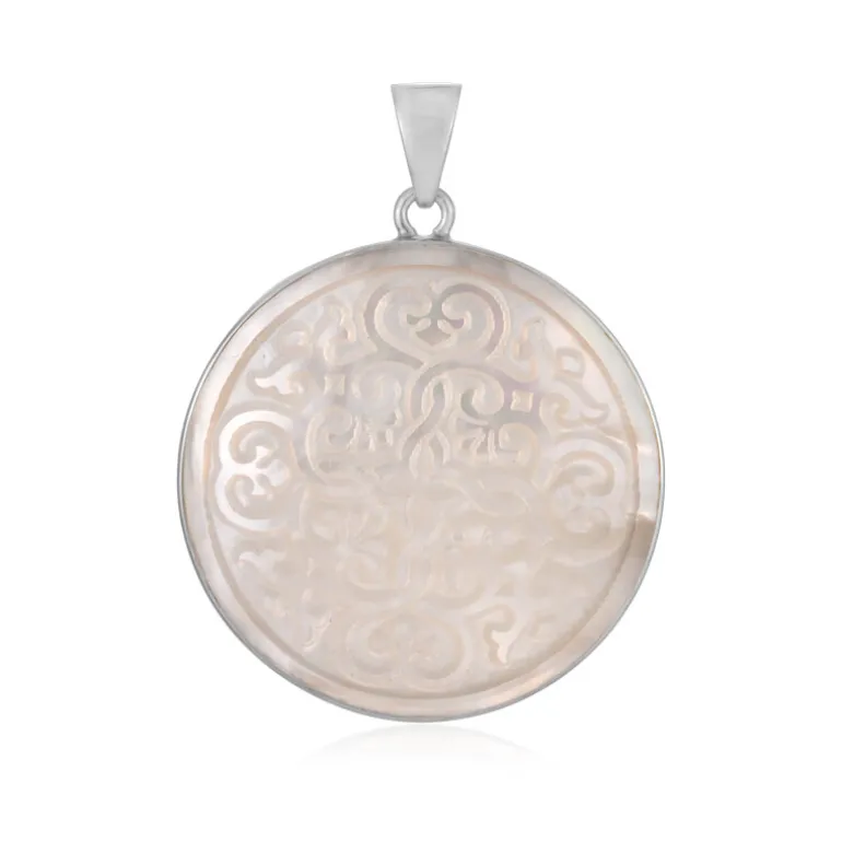 Entdecken Sie die Mystik Indonesiens mit diesem bezaubernden, von Bali Barong inspirierten Anhänger. Dieses moderne Schmuckstück ist aus schillerndem indonesischem Perlmutt geschnitzt und in 925er Sterlingsilber mit Platinfinish gefasst. Das runde, 35 mm große Ornament zeigt verschlungene Muster, die die Essenz der traditionellen balinesischen Kunst einfangen. Mit einem Gewicht von ca. 2,2 Gramm ist dieser Anhänger mit seinem bezaubernden Charme ideal, um sowohl legere als auch formelle Kleidung mit einem Hauch von Eleganz zu versehen.