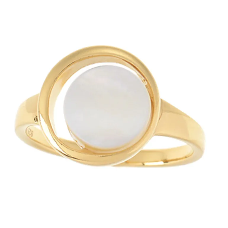 Dieser Ring aus vergoldetem 925er Sterlingsilber präsentiert ein leuchtendes 8 mm großes, rundes chinesisches Perlmutt. Mit einem Gewicht von ca. 1,3 g präsentiert er auf elegante Weise das natürliche Schillern des Edelsteins. Dieser Ring eignet sich sowohl für ein legeres Brunch als auch für einen eleganten Galaabend und verspricht Vielseitigkeit und Charme. Kombinieren Sie ihn mit Pastellfarben oder neutralen Tönen, um seinen ätherischen Glanz zur Geltung zu bringen.