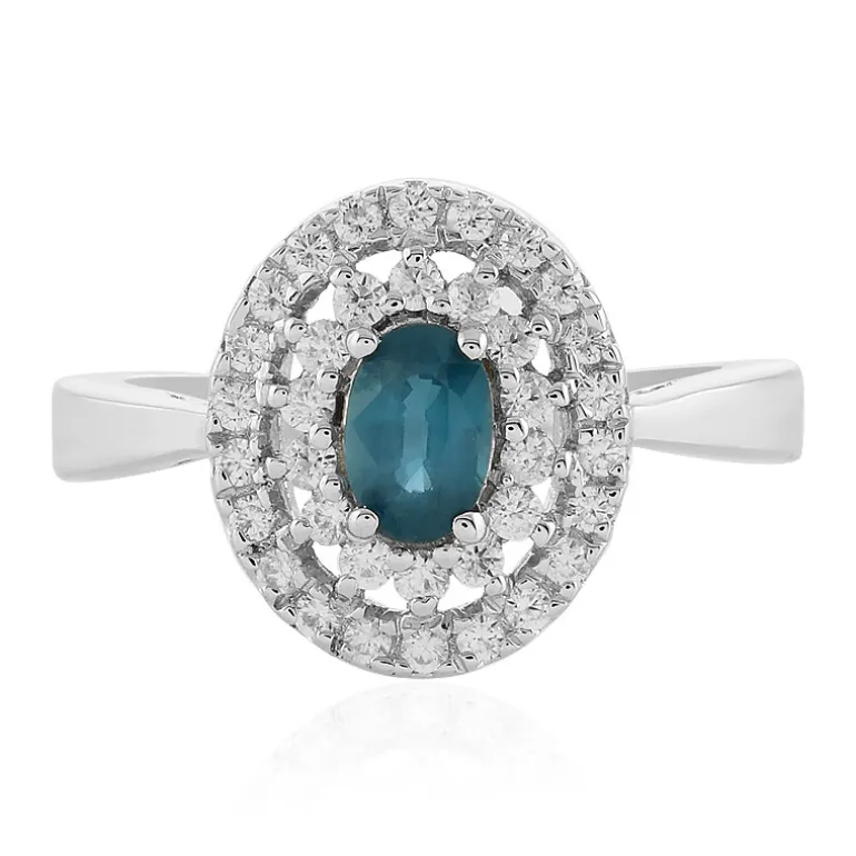 Dieser bezaubernde Ring besteht aus einem luxuriösen petrolblauen indischen Kyanit mit ovalem Schliff und einem Gewicht von 0,616 ct. Der zentrale Edelstein ist von einem glitzernden Halo aus kambodschanischen Zirkonsteinen mit einem Gesamtgewicht von 0,627 ct umgeben, der einen atemberaubenden Kontrast zum glänzenden 925er Sterlingsilberband bildet. Dieses Schmuckstück strahlt Raffinesse aus und ist ein ideales Accessoire sowohl für die Eleganz am Tag als auch für den Glamour am Abend. Das Gesamtgewicht der Edelsteine von 1,243 ct macht ihn zu einer wertvollen Ergänzung für jede Sammlung. Das filigrane Design macht diesen Ring zu einem auffälligen Schmuckstück, das sich perfekt mit einem schicken Cocktailkleid oder einem formellen Ensemble kombinieren lässt.