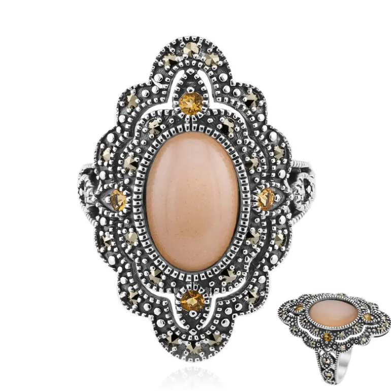 Dieser klassisch inspirierte Ring von Annette besticht durch seinen ovalen Cabochon-Pfirsich-Mondstein aus Sri Lanka, gefasst in luxuriösem 925er Sterlingsilber. Flankiert vom warmen Schein eines Zitrins aus Madagaskar und Akzenten aus österreichischem Markassit, wiegt dieses Stück insgesamt 3,59 Karat. Das verschlungene Design strahlt eine zeitlose Eleganz aus, die sowohl tagsüber als auch abends einen Hauch von Raffinesse verleiht. Die Vintage-Ästhetik dieses Rings macht ihn zu einem Evergreen in jeder Schmucksammlung.
