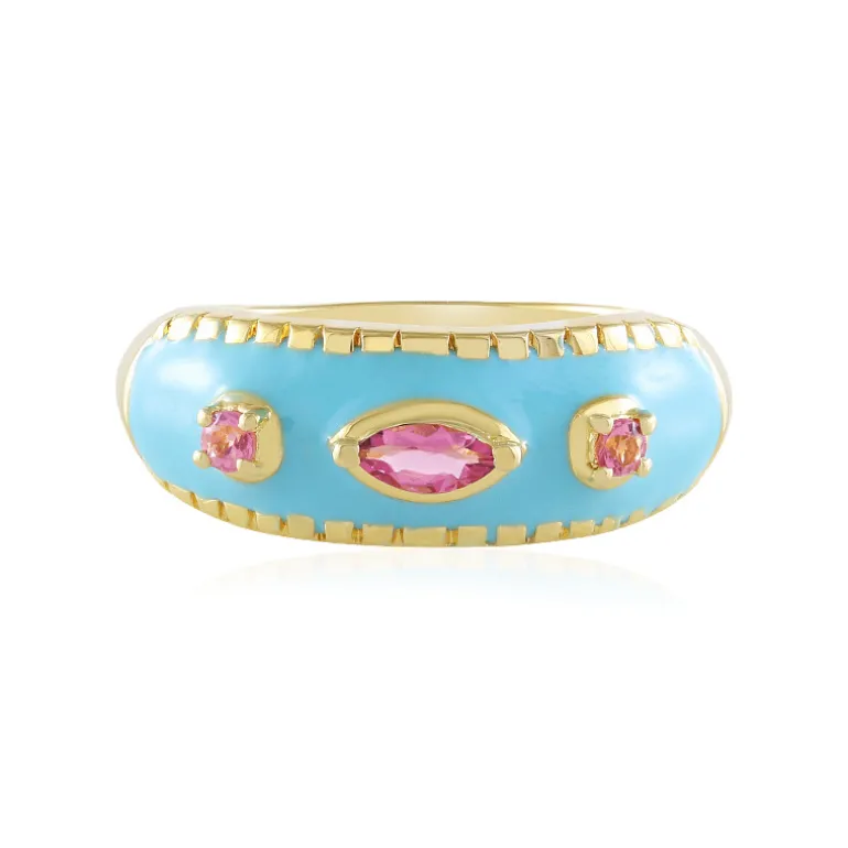 Entdecken Sie die Eleganz dieses auffälligen Rings mit atemberaubenden rosa Turmalinen aus Brasilien. In luxuriösem vergoldetem Sterlingsilber gefasst, bilden die Edelsteine im Marquise- und Rundschliff einen glamourösen Kontrast zu dem leuchtend blauen Band. Mit einem Gesamtgewicht von 0,171 ct ist dieses Schmuckstück perfekt geeignet, um Ihrer Abendgarderobe oder einem schicken Brunch-Ensemble einen Hauch von Farbe zu verleihen. Peppen Sie Ihre Schmucksammlung mit diesem exquisiten Design auf.
