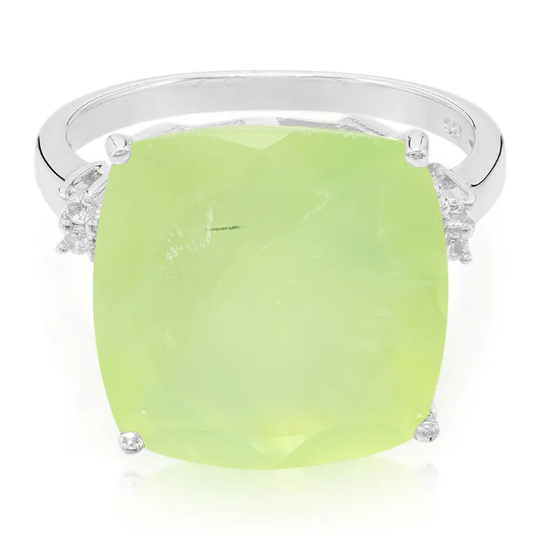 Präsentieren Sie ein Stück der natürlichen Schönheit Australiens mit diesem atemberaubenden Ring aus 925er Sterlingsilber. Sein Herzstück ist ein 9,23 Karat schwerer australischer Prehnit, der für seinen sanften grünen Farbton und seinen antiken Kissenschliff begehrt ist. Das Band ist mit acht funkelnden weißen Topasen aus Brasilien akzentuiert, die ihm einen Hauch von Brillanz verleihen. Dieser Ring ist perfekt, um Ihrem Ensemble einen Farbtupfer zu verleihen, und eignet sich sowohl für den eleganten Alltag als auch als Blickfang für besondere Anlässe.