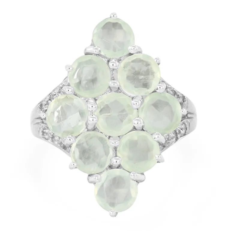 Entdecken Sie die ruhige Schönheit dieses Rings aus australischem Prehnit mit einer Konstellation aus neun Edelsteinen von insgesamt 3,69 Karat, von denen jeder mit einem Rundschliff versehen ist, der ihm zusätzliche Dimension verleiht. Diese blassgrüne Anordnung wird von acht funkelnden brasilianischen Weißtopasen umrahmt, die das Herzstück sorgfältig ergänzen. Das harmonische Design dieses anmutigen Schmuckstücks aus 925er Sterlingsilber mit einer Größe von 24 x 20 mm ist ein wahrer Lichtfang. Der Ring ist perfekt geeignet, um sowohl tagsüber als auch am Abend einen Hauch von Eleganz zu verleihen, und verspricht eine vielseitige Ergänzung für jede Schmucksammlung zu sein.