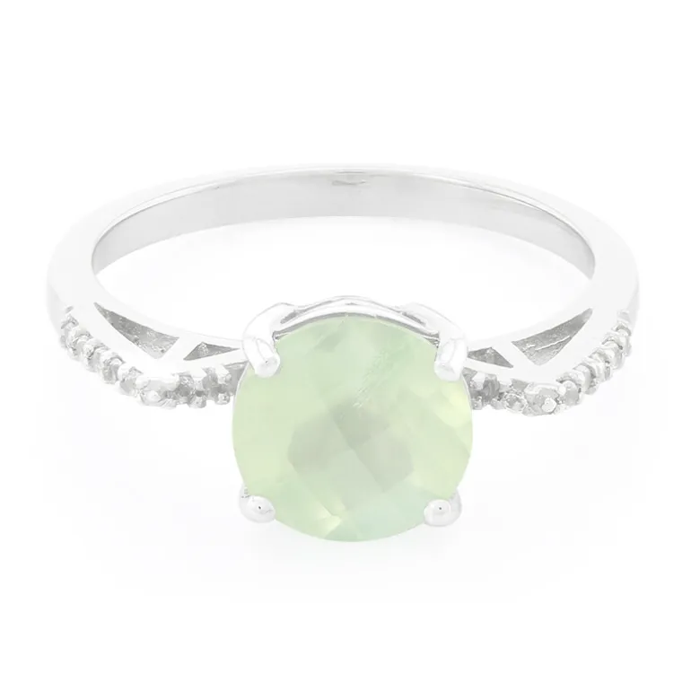 Unser bezaubernder Ring aus Sterlingsilber ist mit einem 1,69-karätigen australischen Prehnit verziert, der meisterhaft in eine runde Schachbrettform geschliffen wurde. Das satte Grün des zentralen Edelsteins wird durch 12 brasilianische weiße Topase ergänzt, die jeweils im Präzisionsschliff geschliffen wurden, um maximale Brillanz zu erzielen. Der Ring ist aus hochwertigem 925er Sterlingsilber gefertigt und verbindet Eleganz mit Langlebigkeit. Er wiegt etwa 1,9 Gramm. Er ist ein vielseitiges Accessoire, das sowohl zu legerer als auch zu formeller Kleidung passt und bei jeder Veranstaltung für Gesprächsstoff sorgen wird.
