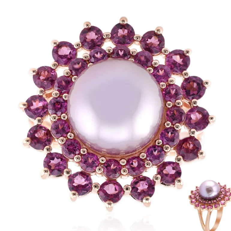 Entdecken Sie die Anziehungskraft dieses faszinierenden Rings, der eine glänzende, runde 10 mm große Ming-Perle aus China inmitten eines Halos aus 16 brasilianischen Rhodolith-Edelsteinen von insgesamt 1,28 ct. präsentiert, die durch weitere 16 Rhodolithen von 0,736 ct. ergänzt werden. Gefertigt aus 925er Sterling Silber mit einer zarten Rosévergoldung, bietet dieses Schmuckstück eine harmonische Mischung aus klassischer Eleganz und modernem Flair. Mit seinen satten violetten Farbtönen und seinem beeindruckenden Design ist er ein außergewöhnliches Accessoire, das sich sowohl für besondere Anlässe als auch für den Alltag eignet.