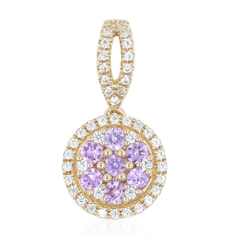 Schwelgen Sie in der Opulenz dieses atemberaubenden Anhängers mit sieben violetten Ceylon-Saphiren im Rundschliff, die eine königliche Aura ausstrahlen. Die Kreation aus 9 Karat Gelbgold wiegt ca. 1,68 g und hat ein Gesamtkaratgewicht von 0,721, eingebettet in funkelnde Zirkonakzente aus Kambodscha. Mit einer Größe von 20,5 x 11 mm hängt er anmutig in der Luft und ist eine prestigeträchtige Ergänzung zur eleganten Abendgarderobe oder ein raffiniertes Accessoire für Ihr Tagesensemble.