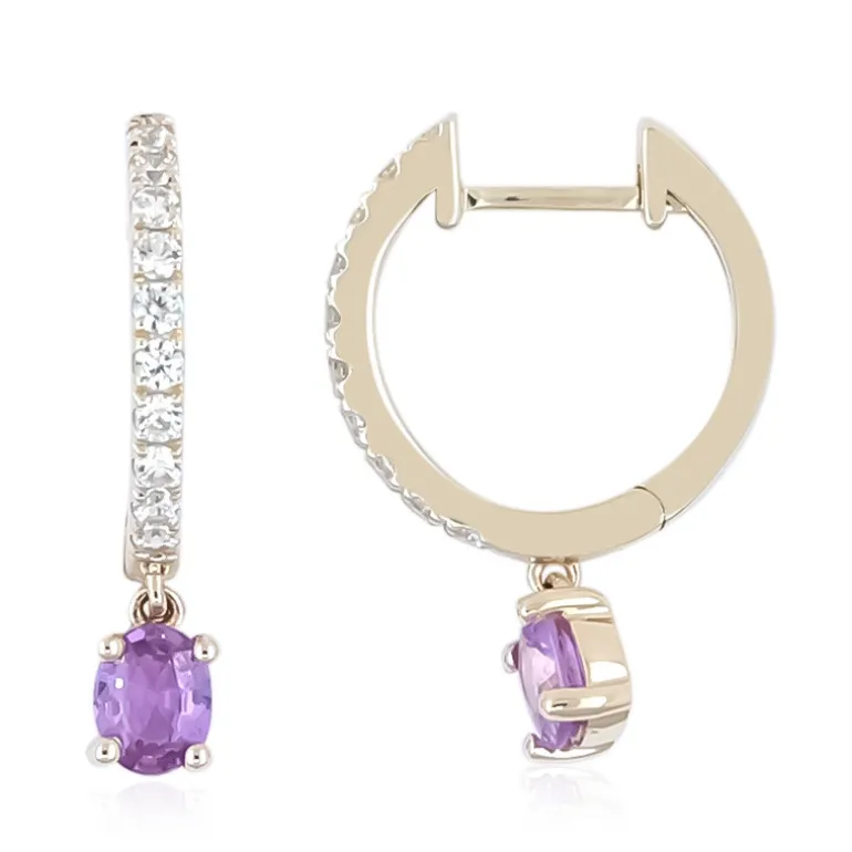 Entdecken Sie die königliche Anziehungskraft dieser exquisiten Ohrringe mit violetten Ceylon-Saphiren aus Sri Lanka, die in schimmerndem 9-karätigem Gelbgold gefasst sind. Diese Ohrringe glänzen mit einer zusätzlichen Verzierung aus kambodschanischen Zirkon-Akzenten von insgesamt 0,396ct. Die oval geschliffenen Saphire mit einem Gewicht von 0,632 ct. sorgen für einen prächtigen Farbakzent, während die Zirkonsteine im Rundschliff einen Hauch von Funkeln hinzufügen, was diese Ohrringe zu einem Muss für jede Gelegenheit macht, die nach einem Hauch von Eleganz verlangt. Diese Ohrringe eignen sich sowohl für den eleganten Tag als auch für den glamourösen Abend und vervollständigen jedes Ensemble mit ihrem luxuriösen Charme.
