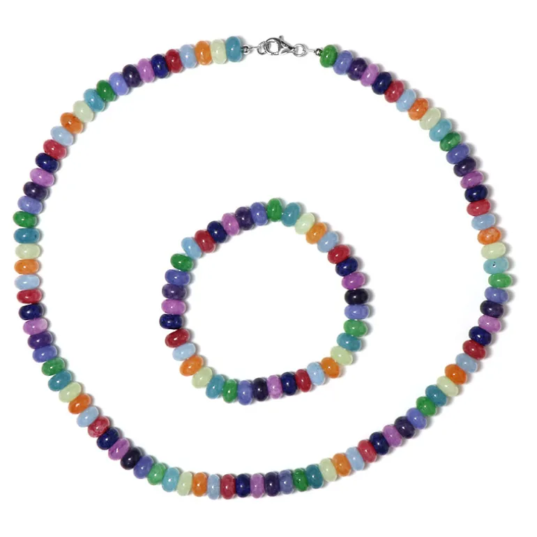 Tauchen Sie ein in ein Spektrum der Eleganz mit diesem strahlenden brasilianischen Regenbogenquarz-Perlen-Set. Gefertigt aus 925er Sterlingsilber und mit einem beeindruckenden Gesamtkaratgewicht von 318,53 ct. ist dieses auffällige Duo ein Paar aus einem 18 cm langen Armband und einer 45 cm langen Halskette. Jede der ca. 8 mm großen Perlen zeigt eine Symphonie von Farben – von Meeres- und Pazifikblau bis hin zu königlichen Tönen und üppigem Grün -, die an die lebendigen Landschaften Brasiliens erinnern. Perfekt, um dem Alltag eine verspielte und doch raffinierte Note zu verleihen oder einen lässigen Abendlook aufzuwerten.