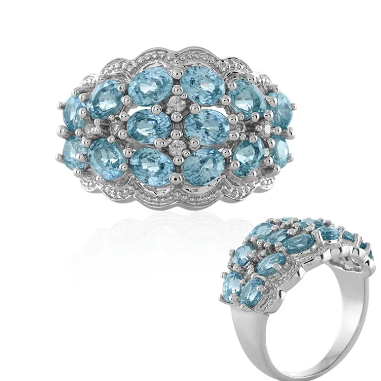Entdecken Sie die strahlende Schönheit dieses schicken kambodschanischen Zirkonrings im Ratanakiri-Schliff mit insgesamt 14 himmelblauen Edelsteinen im Ovalschliff, die sorgfältig in einem Vintage-Design angeordnet sind. Das Schmuckstück aus 925er Sterlingsilber mit Platinbeschichtung hat ein beeindruckendes Gewicht von 3,612 ct und wird von 0,152 ct Zirkonen im Rundschliff aus Tansania ergänzt. Er ist der Inbegriff kunstvoller Eleganz und eignet sich für anspruchsvolle Soireen oder als glamouröser Alltagsschmuck.