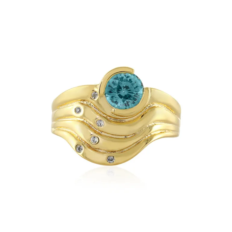 Tauchen Sie ein in den fesselnden meergrünen Charme unseres kambodschanischen Ratanakiri-Zirkons, der anmutig in einen gewellten, vergoldeten Sterlingsilberring eingebettet ist. Das atemberaubende Mittelstück von 1,311 Karat ist mit kleinen glitzernden weißen Topasen aus Madagaskar besetzt, die diesem exquisiten Schmuckstück einen zusätzlichen Glanz verleihen. Dieser einzigartige Ring mit einem Gewicht von ca. 5,54 g hat ein modernes Wellendesign, das Eleganz für jeden Anlass widerspiegelt. Er passt perfekt zu einem Cocktailkleid oder wertet ein Alltagsoutfit auf und verspricht, für Gesprächsstoff zu sorgen.