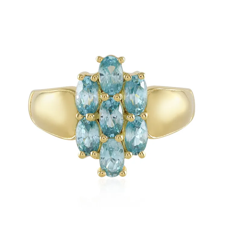 Entdecken Sie die bezaubernde Schönheit dieses Rings aus vergoldetem 925er Sterlingsilber mit einem Strauß aus sieben azurblauen Ratanakiri Zirkonen von insgesamt 2,29 Karat. Jeder Edelstein wurde meisterhaft in eine ovale Form geschliffen, die etwa 5 x 3 mm misst, und sorgfältig gefasst, um eine floral inspirierte Anordnung zu schaffen, die Eleganz ausstrahlt. Der warme Farbton der Goldplattierung bildet einen atemberaubenden Kontrast zum kühlen Blau der Zirkone und macht diesen Ring zu einer vielseitigen Ergänzung für jedes Outfit, sei es für einen legeren Brunch oder einen Abend im Freien. Sein kompliziertes Design und seine kambodschanische Herkunft sorgen dafür, dass er nicht nur ein Schmuckstück ist, sondern auch für Gesprächsstoff sorgt.