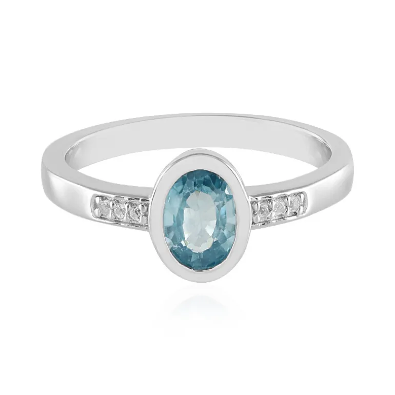 Entdecken Sie die Faszination dieses atemberaubenden Zirkonrings aus Ratanakiri mit einem kambodschanischen Edelstein im Ovalschliff von 1,026 Karat, der von Sterlingsilber umschlossen wird. Sechs funkelnde weiße Topase aus Indien, jeder im Rundschliff und mit einem Gesamtgewicht von 0,027 ct, betonen den lebhaften blauen Farbton des Hauptsteins. Der Ring besteht aus 2,24 g 925er Sterlingsilber und ist mit einem Gesamtgewicht von 1,053 ct ein Beispiel für Raffinesse. Er ist perfekt, um jedem Ensemble einen Hauch heiterer Eleganz zu verleihen, und eignet sich gleichermaßen für den Charme des Tages wie für die Anmut des Abends.