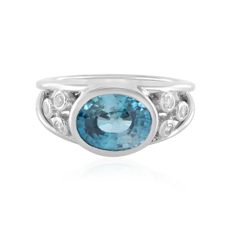 Entdecken Sie die fesselnde Anziehungskraft dieses atemberaubenden Rings, dessen Herzstück ein prächtiger ovaler Ratanakiri-Zirkon von 3,701 Karat im Brillantschliff aus Kambodscha ist. Das kühle blaue Funkeln des zentralen Edelsteins wird durch die schimmernde Gruppe von sechs Zirkonen im Rundschliff von insgesamt 0,194 ct ergänzt, die daneben gefasst sind. Der Ring wurde sorgfältig aus 925er Sterlingsilber gefertigt und für zusätzliche Haltbarkeit und Glanz mit einer Platinplattierung versehen. Er wiegt ca. 4,34 g. Das exquisite Design erstreckt sich über eine anmutige Größe von 25 x 21 mm am Finger und macht ihn zu einem geschmackvollen Statement sowohl für legere als auch formelle Ensembles.