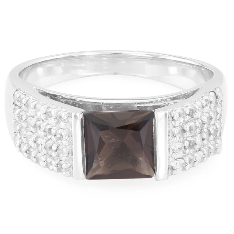 Entdecken Sie die Faszination des brasilianischen Rauchquarzes in diesem Ring aus Sterlingsilber mit einem quadratischen Prinzess-Schliff von 0,74 Karat in der Mitte. Um den rauchigen Farbton herum sind 48 schillernde weiße Topase von insgesamt 0,436 ct, jeder im runden Brillantschliff. Der aus 925er Sterlingsilber gefertigte Ring hat ein Gesamtgewicht von 1,18 Karat und misst an der Hand 24 x 20 mm. Dieser Ring ist ideal, um Ihrer Geschäftskleidung einen Hauch von Raffinesse zu verleihen oder einen eleganten Abendlook zu unterstreichen, und passt zu einer breiten Palette von Stilen.