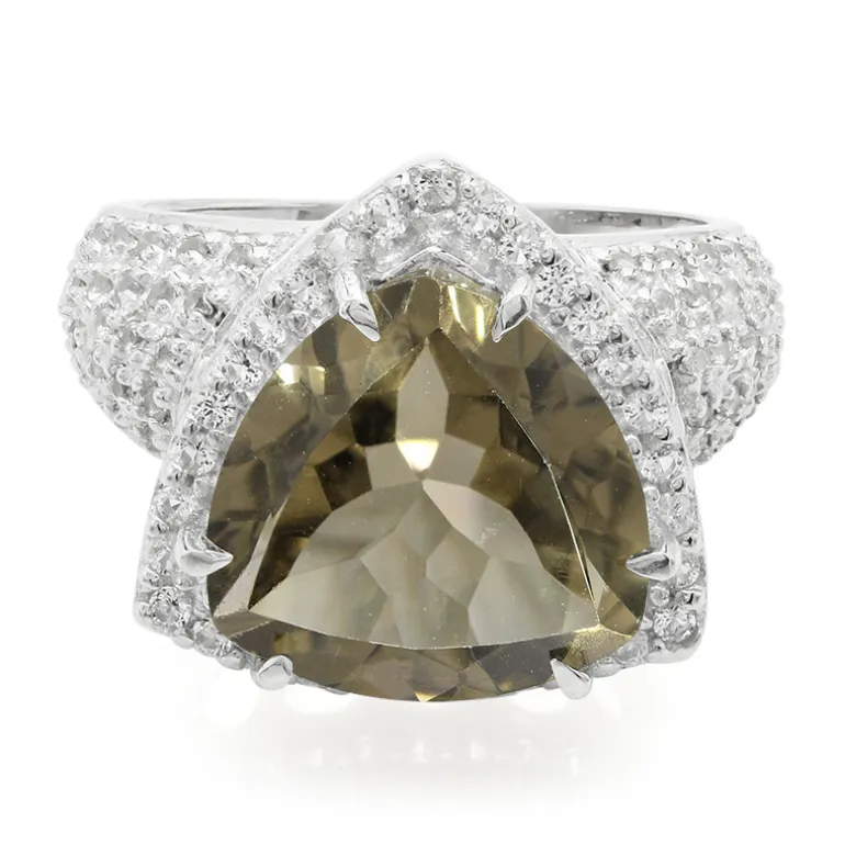 Entdecken Sie die Mystik dieses fesselnden Rings aus 925er Sterlingsilber mit einem brasilianischen Rauchquarz im Trillantschliff von 4,95 Karat, der ein warmes, erdiges Leuchten ausstrahlt. Um das Herzstück herum befinden sich 90 schimmernde weiße Topase von insgesamt 0,669 Karat, die in einem glänzenden Muster gefasst sind und einen funkelnden Kontrast bilden. Dieses Schmuckstück ist ideal, um jedem Ensemble einen Hauch von Raffinesse zu verleihen. Es ist sowohl vielseitig für den Alltag als auch umwerfend für besondere Anlässe.